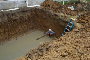 So how did we do it? What worked well and what would we have done differently? The excavator we chose was highly skilled and did an excellent job of digging the cistern and the rest of our foundation. However, I should have jumped down into the 8 foot deep, 8 foot wide and 12 foot long hole to see that the bottom measured 8 x 12 as well. It wasn’t until after the excavator was gone that I realized that the hole was smaller at the bottom than at the top. Oops. This caused me untold aggravation building an oddly shaped form and cost us about 1000 gallons in decreased capacity.
