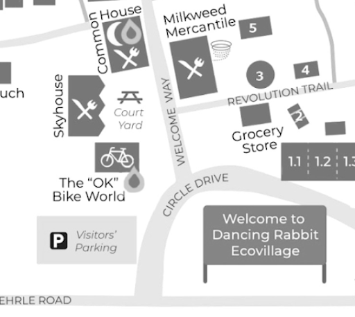 When you get to Dancing Rabbit, you can park in the lot on the east end of our driveway, by the community garden. The Mercantile is the first white building on the right as you enter the village. We are a pedestrian community and ask guests to leave their cars in the parking lot. If you have mobility issues or need to pull up to the Mercantile for loading and unloading, just talk with one of us and we can arrange it.