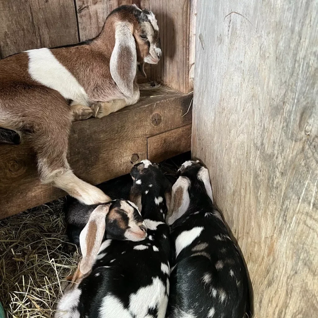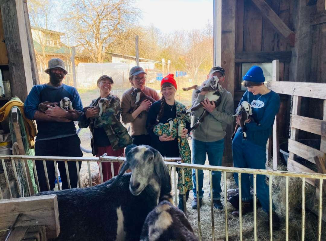 It’s baby goat season, and I’d much rather think about that. Because the Dairy Co-op values letting mothers raise their own babies instead of having milkers bottle-feed them, socializing the kids in other ways becomes that much more important. In my non-farmer opinion, the best way to socialize a baby goat is to head down to the barn on a beautiful afternoon and scoop one up in your arms while talking with your neighbors. On particularly joyful days, a baby goat themed happy hour event emerges, where community members drop in, hold baby goats together, and talk about village goings-on in those few blessed hours before dinner.