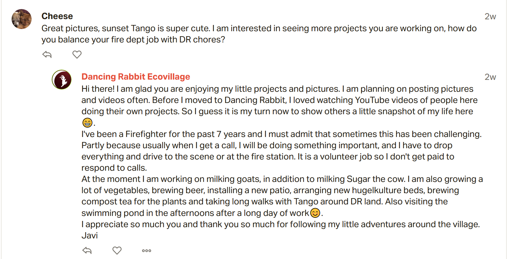 We hope that you join us on this platform. We love to answer your questions and show you what we are doing. Giving a snapshot into this lifestyle that we have dedicated ourselves to is one of our greatest joys. Educating and exploring with each other that a different way forward is possible drives our village. You can be a part of it by contributing to a mutual connection between Dancing Rabbit, you, and the planet we are taking care of together.