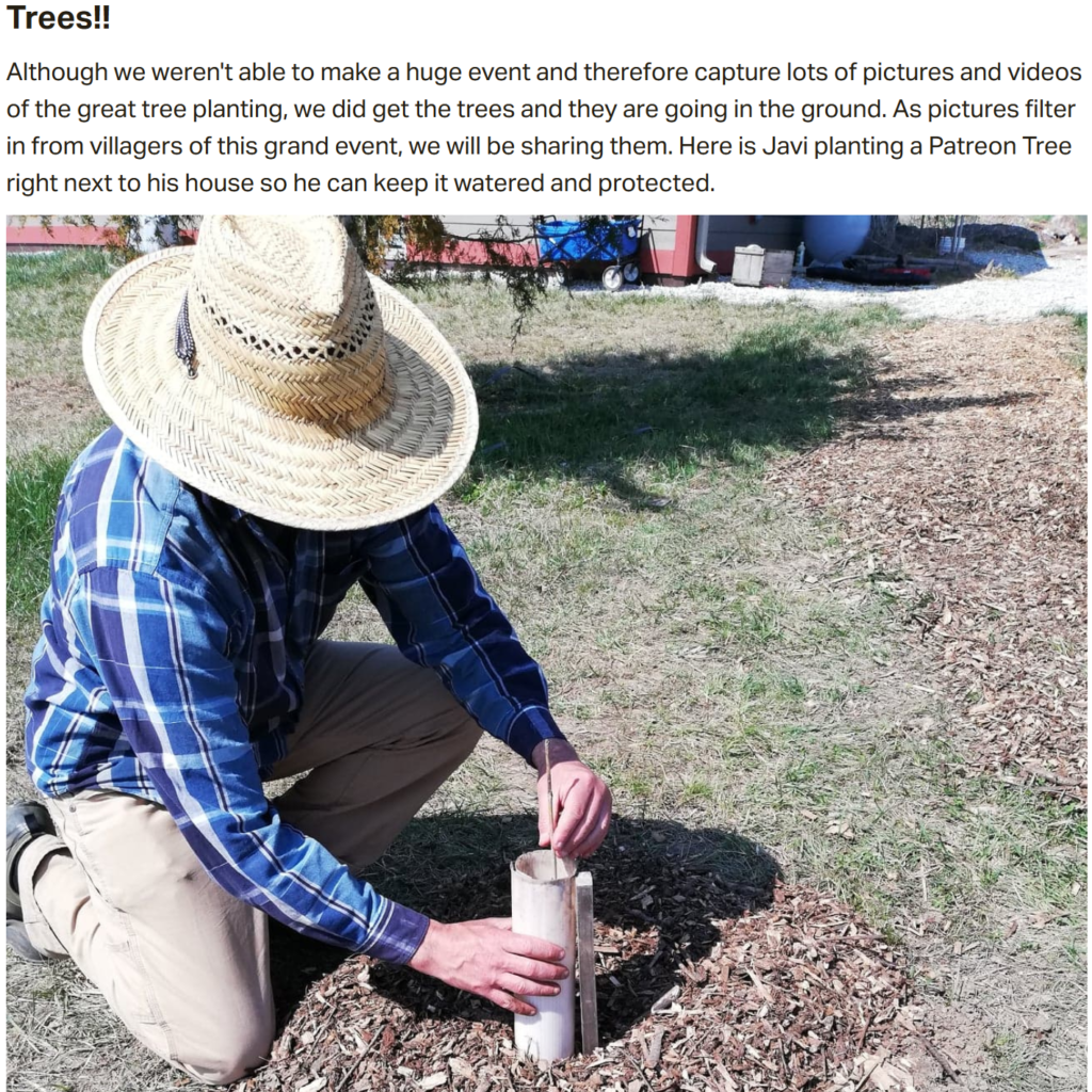 By joining us for as little as $1 a month, you will receive access to all of our Patreon content and get a more intimate view of life at Dancing Rabbit Ecovillage. If you’d like to be more involved you can join us at the $5 or more a month levels. Here you will be able to help us further our mission to provide a sustainable environment for humans and animals alike out on our corner of the prairie by planting native trees. This past year we were able to plant 80 trees around the village to help provide shade, food, and homes for our native wildlife along with benefitting villagers from the wonderful support we received on Patreon.