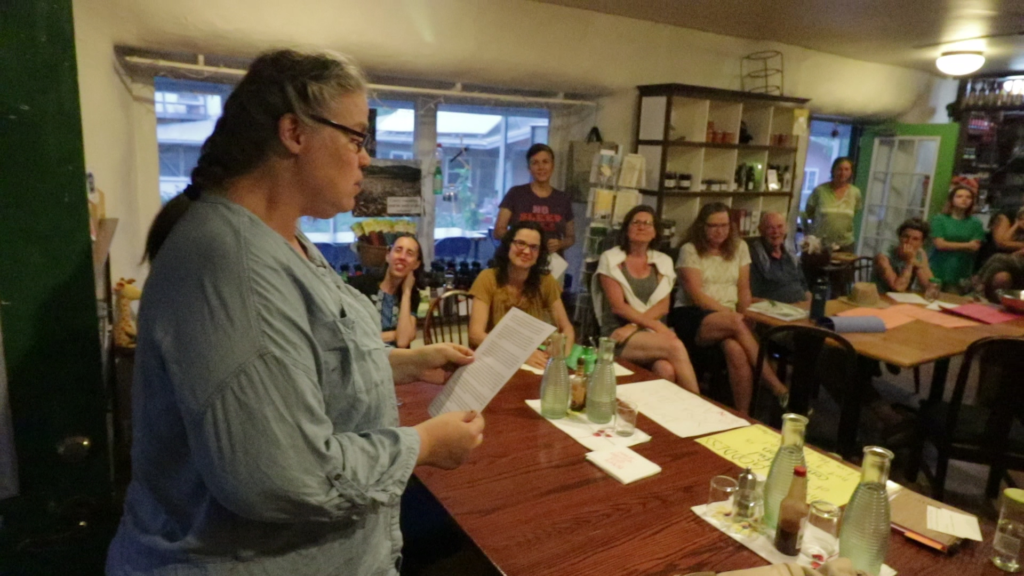 With some of my newly-gained spare time I am able to attend the weekly Dancing Rabbit Writing Group. A group of folks (often including Tereza, Vick, Prairie and Benji) gather each Wednesday morning in the Mercantile. We close our eyes and take turns choosing a few slips of paper from a bag, all of which have a single word scrawled on both sides (blue paper for nouns, red for verbs, and yellow for adjectives). We read the words aloud and then then give ourselves 14 minutes to use them in a piece. The chosen words often seem to have nothing in common and are really fun to try to put together. Examples of some of the past word groupings: continue, irritate, and colossal; x-ray, scrub, and boundless; phobic, drum, and mean; garbage, substantial, and encourage. Ha! When the time is up, we each read aloud what we’ve written. I am constantly in awe of the talent of my fellow writers, and amazed by just how differently we use the same words. We follow the guidelines set by Frankie Voeltz and Jennifer Morales in the Milkweed Mercantile’s annual writing workshops, such as: we assume all writing is fiction (even if the story sounds suspiciously like the writer’s own life, we assume it is “made up,” helping the process feel much more easeful and adventurous), we treat each other respectfully, and we make no disclaimers for our writing (this one is so difficult!). Writing with this group is one of my favorite things to do each week, just as the writing workshops have become my favorite week of each year. Our 2019 five-day Writing Workshop will be in August this year, led once again by Frankie Voeltz and Jennifer Morales. If you’ve ever been interested in trying a writing workshop but haven’t felt brave enough, or if you’re a writer who would like to surround yourself with support, encouragement and kindred spirits, I encourage you to take a look. Frankie and Jennifer create a safe space where laughter abounds and tears are welcome, where creativity flows as fast as the encouragement, and where all talent is nurtured. Plus, the food is really, really good.