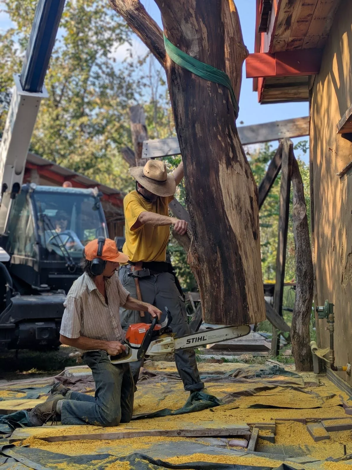 We had several work exchangers from earlier in the year return to help us with this project, and I don’t think I’ve ever had such a qualified crew. We had three people who could drive the telehandler (the machine that lifts the heavy logs and the 1200-pound Big Mama post into place). The wexers were looking for experience working with round wood and using timber framing techniques to connect rafters to posts and beams. DR Rabbit Alis was the mastermind of this part of the project, and I’m grateful to have someone with these skills in the village, who is willing to share them with others.